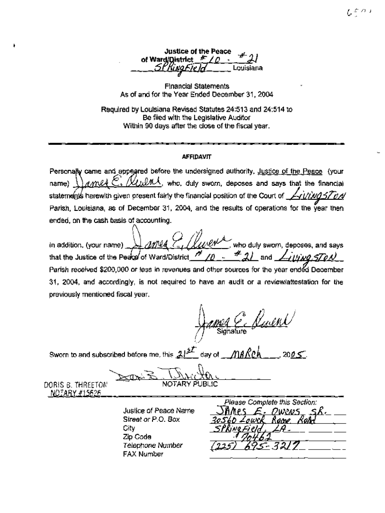 Justice of the Peace of Ward/District Louisiana Financial Statements As of and for the Year Ended December 31, 2004, Required by Louisiana Revised Statutes 24:513 and 24:514 to Be filed with the Legislative
