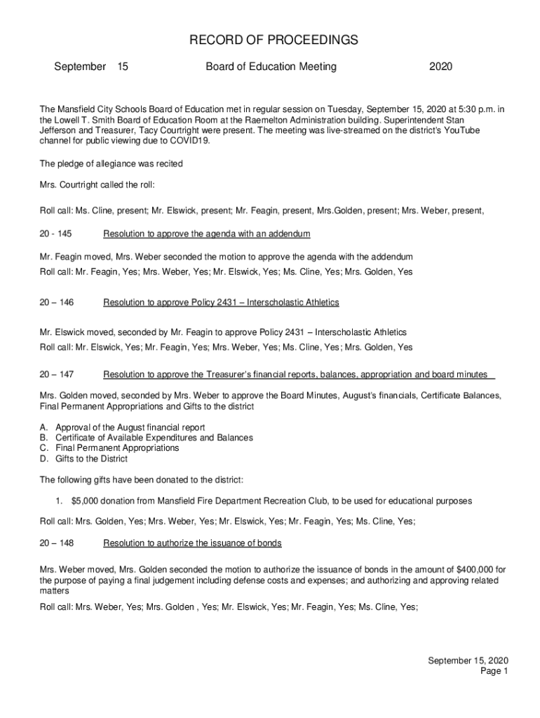 RECORD OF PROCEEDINGS September 15Board of Education Meeting2020The Mansfield City Schools Board of Education met in regular session on Tuesday, September 15, 2020, at 5:30 p.m. in the Lowell T. Smith