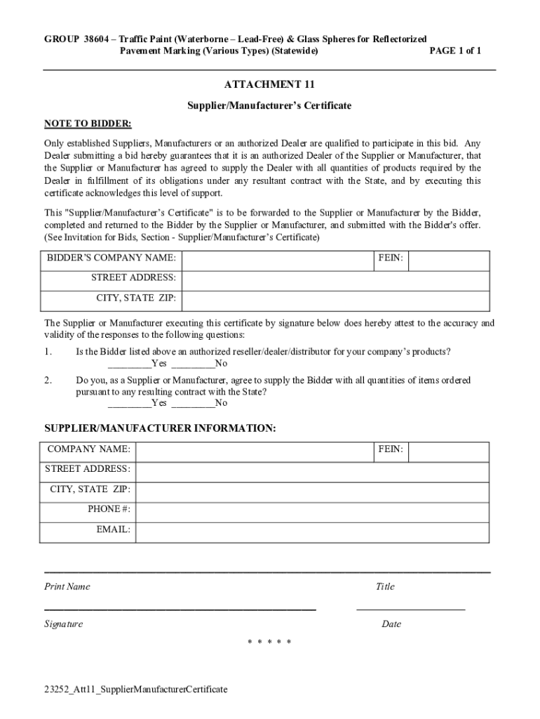 GROUP 38604 Traffic Paint (Waterborne Leader) & Glass Spheres for Reflectorized Pavement Marking (Various Types) (Statewide) PAGE 1 of 1ATTACHMENT 11 Supplier/Manufacturers Certificate NOTE TO BIDDER: