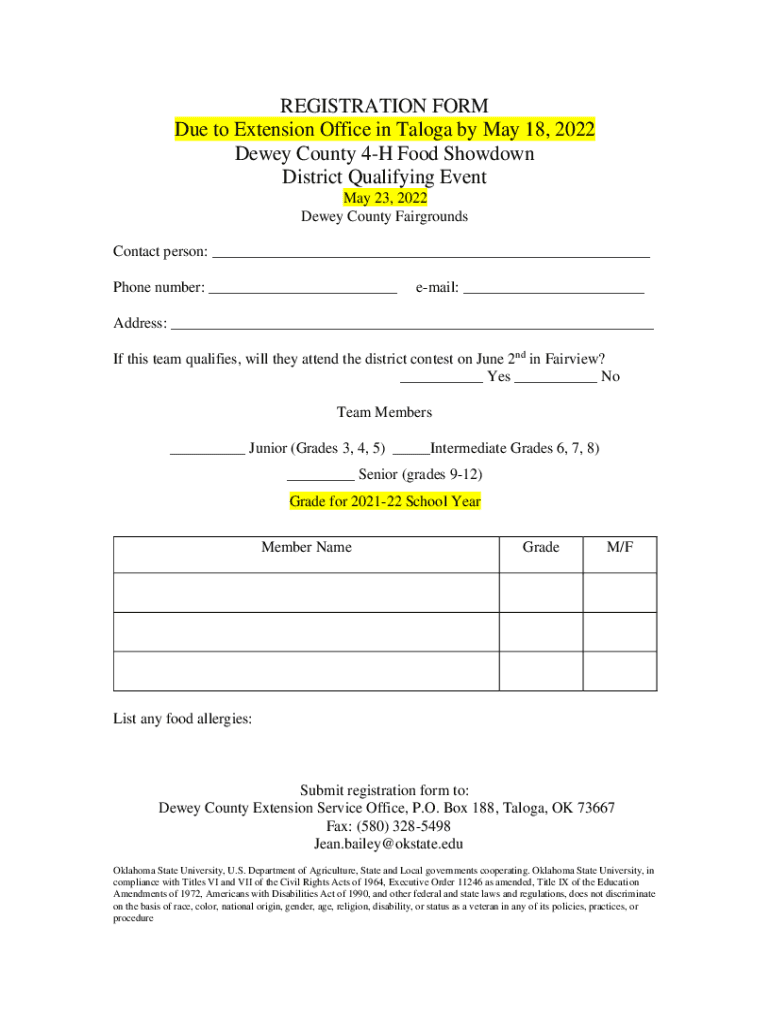 REGISTRATION FORM Due to Extension Office in Tacoma by May 18, 2023, Dewey County 4H Food Showdown District Qualifying Event May 23, 2023, Dewey County Fairgrounds Contact person: ___ Phone number: