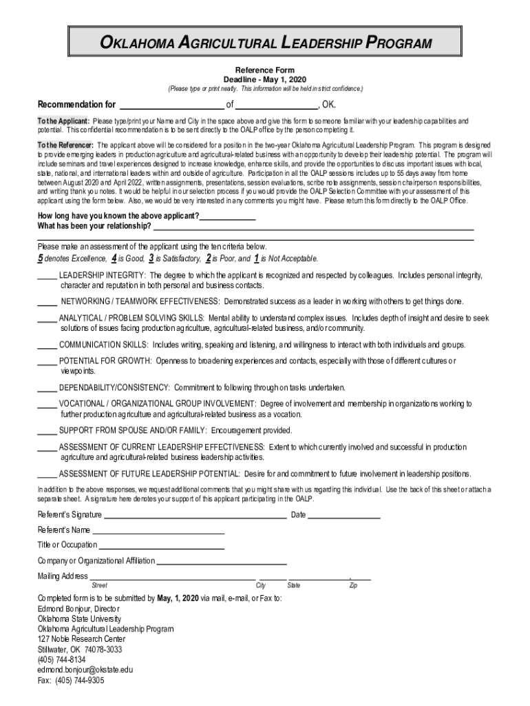 OKLAHOMA AGRICULTURAL LEADERSHIP PROGRAM Reference Form Deadline May 1, 2020 (Please type or print neatly. This information will be held in strict confidence.) Recommendation for of, OK. To the Applicant: