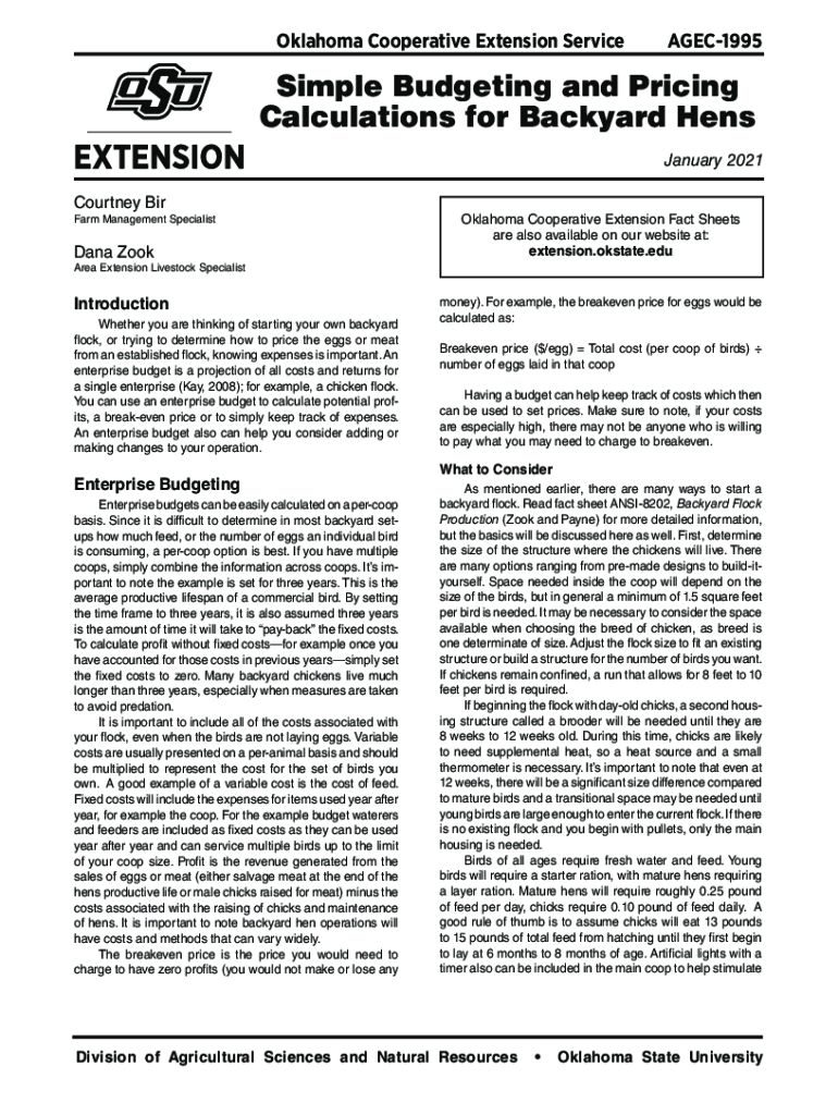 Oklahoma Cooperative Extension ServiceAGEC1995Simple Budgeting and Pricing Calculations for Backyard Hens January 2021 Courtney Firearm Management Specialist Dana ZookOklahoma Cooperative Extension