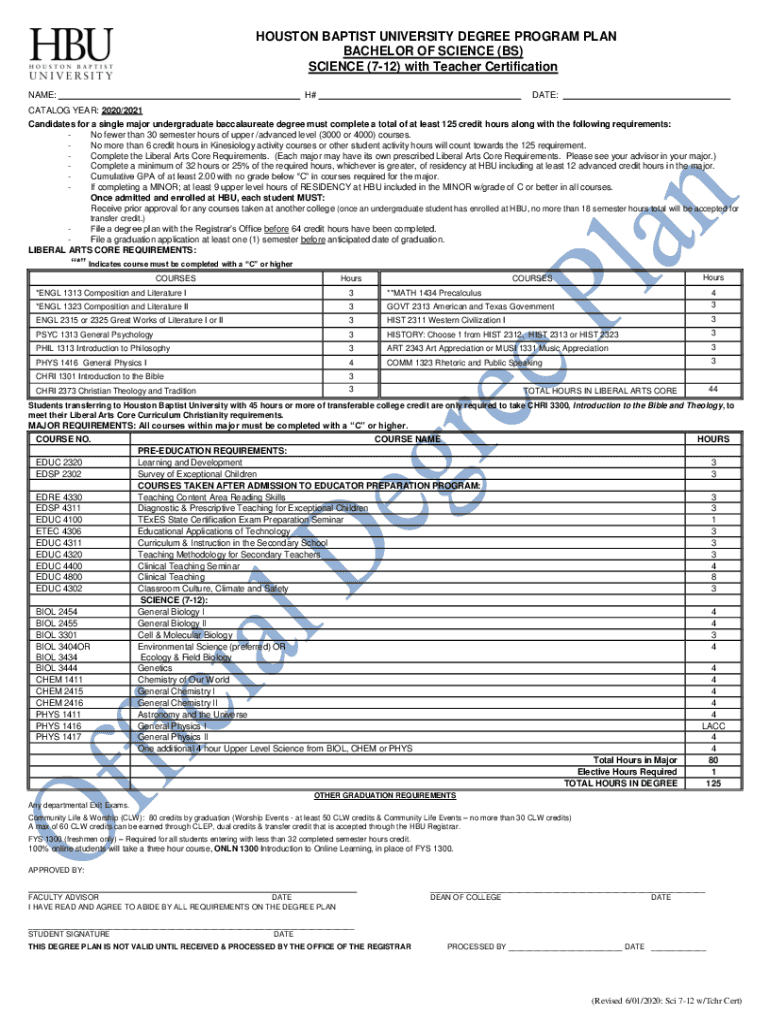 HOUSTON BAPTIST UNIVERSITY DEGREE PROGRAM PLAN BACHELOR OF SCIENCE (BS) SCIENCE (712) with Teacher Certification NAME:H#DATE:CATALOG YEAR: 2020/2021 Candidates for a single major undergraduate baccalaureate