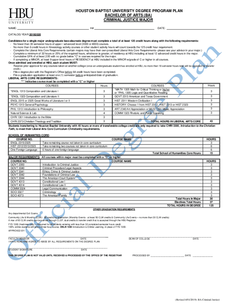 HOUSTON BAPTIST UNIVERSITY DEGREE PROGRAM PLAN BACHELOR OF ARTS (BA) CRIMINAL JUSTICE MAJOR NAME:H#DATE:CATALOG YEAR 20192020 Candidates for a single major undergraduate baccalaureate degree must