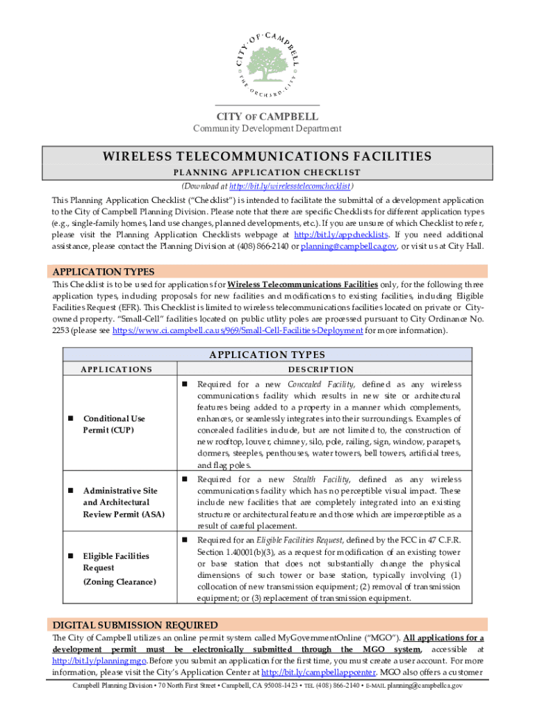 CITY OF CAMPBELLCommunity Development DepartmentWIRELESS TELECOMMUNICATIONS FACILITIES PL AN N I N G A P PL I C A T I O N C H E C K L I ST (Download at http://bit.ly/wirelesstelecomchecklist) This