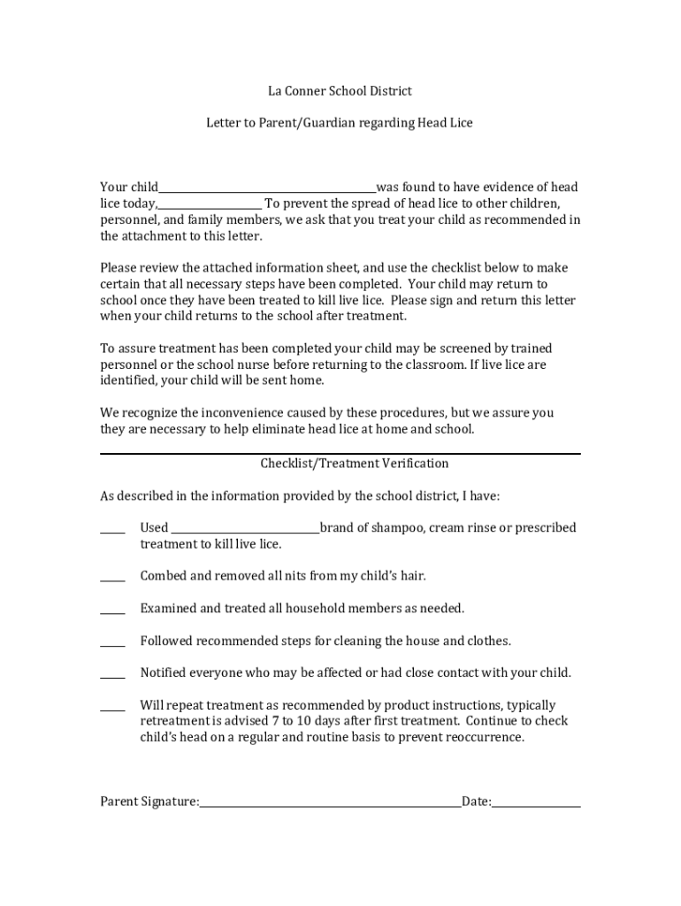 La Conner School District Letter to Parent/Guardian regarding Head Libelous child___was found to have evidence of head lice today, ___ To prevent the spread of head lice to other children, personnel,