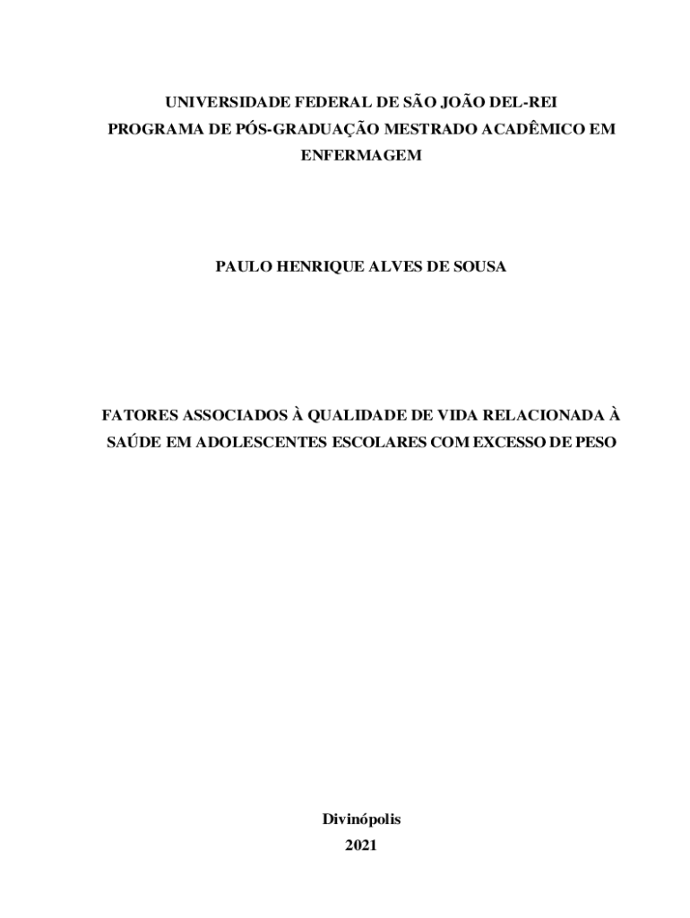 UNIVERSIDADE FEDERAL DE SO TOO DEL REI PROGRAM DE GRADUAL ESTRADA ACADEMIC EM ENFERMAGEMPAULO HENRIQUE ALVES DE SOUSAFATORES ASSOCIATES VALIDATE DE VIDA RELATIONAL SADE EM ADOLESCENTS ESCOLARS COM