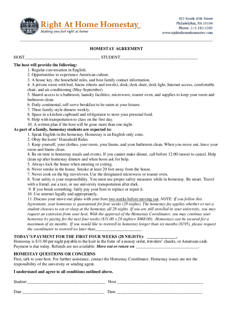 HOMESTAY AGREEMENT HOST___ STUDENT___ The host will provide the following: 1. Regular conversation in English. 2. Opportunities to experience American culture. 3. A house key, the household rules,