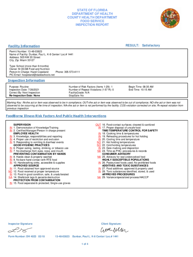 STATE OF FLORIDA DEPARTMENT OF HEALTH COUNTY HEALTH DEPARTMENT FOOD SERVICE INSPECTION REPORTRESULT: SatisfactoryFacility Information Permit Number: 134803823 Name of Facility: Dunbar, Paul L. K8