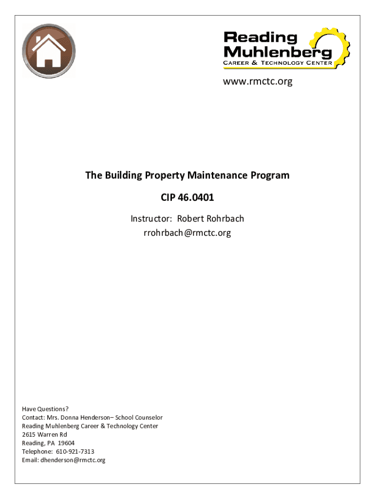 WWW.ROTC.writhe Building Property Maintenance Program CIP 46.0401 Instructor: Robert Roach rrohrbach@rmctc.orgHave Questions? Contact: Mrs. Donna Henderson School Counselor Reading Gutenberg Career