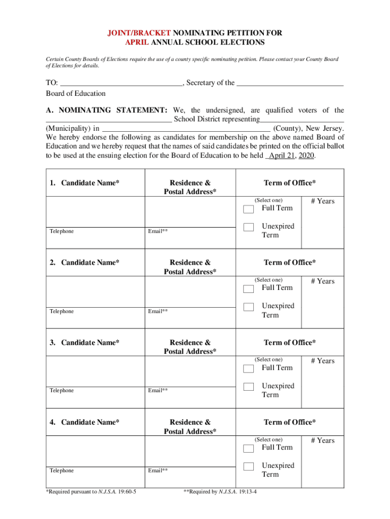 JOINT/BRACKET NOMINATING PETITION FOR APRIL ANNUAL SCHOOL ELECTIONS Certain County Boards of Elections require the use of a county specific nominating petition. Please contact your County Board of