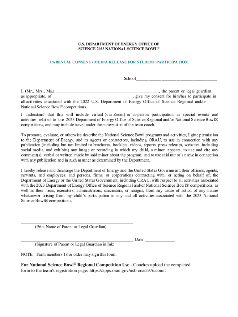 U.S. DEPARTMENT OF ENERGY OFFICE OF SCIENCE 2023 NATIONAL SCIENCE BOWL PARENTAL CONSENT / MEDIA RELEASE FOR STUDENT PARTICIPATIONSchool___ I, (Mr., Mrs., Ms.) ___, the parent or legal guardian, as