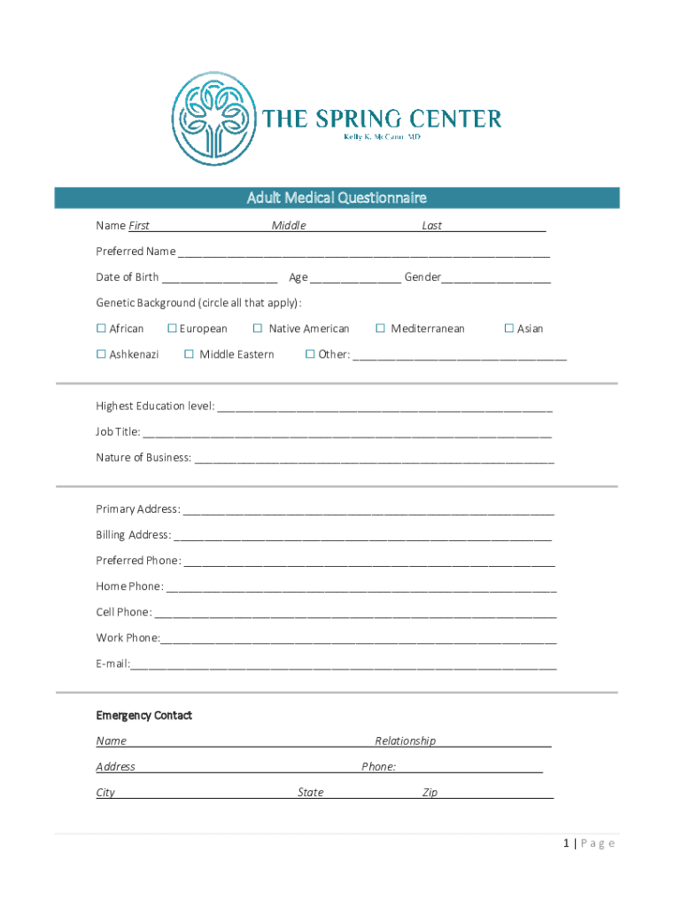 Adult Medical Questionnaire Name FirstMiddleLast___Preferred Name ___ Date of Birth ___ Age ___ Gender___ Genetic Background (circle all that apply): African Ashkenazi European Native American Middle
