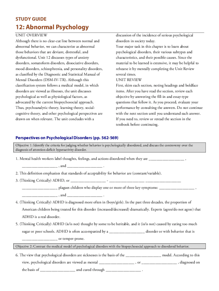 STUDY GUIDE12: Abnormal Psychology UNIT OVERVIEW Although there is no clear-cut line between normal and abnormal behavior, we can characterize as abnormal those behaviors that are deviant, distressful,