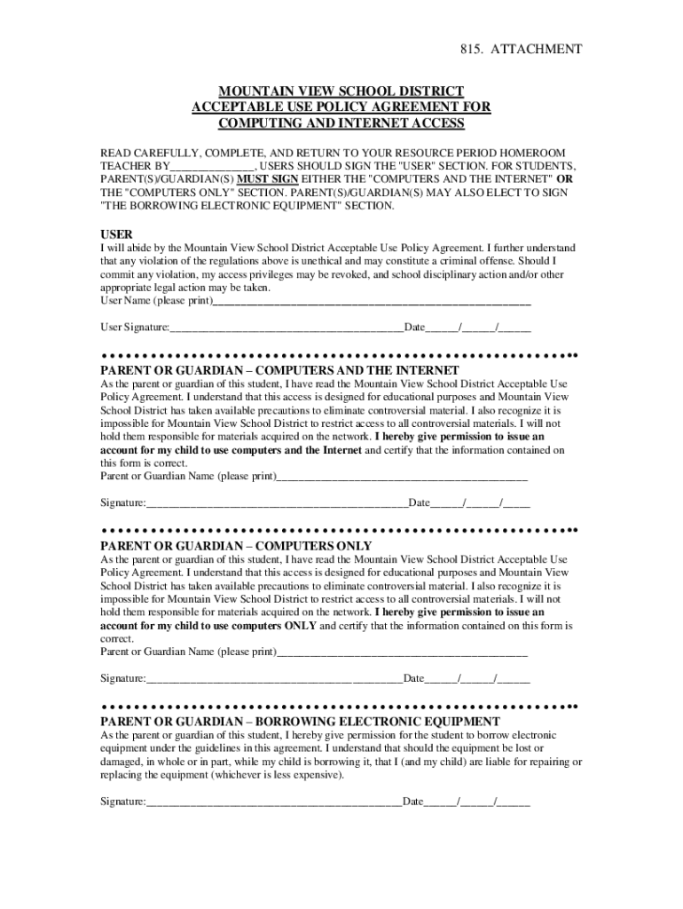 815. ATTACHMENT MOUNTAIN VIEW SCHOOL DISTRICT ACCEPTABLE USE POLICY AGREEMENT FOR COMPUTING AND INTERNET ACCESS READ CAREFULLY, COMPLETE, AND RETURN TO YOUR RESOURCE PERIOD HOMEROOM TEACHER BY___,