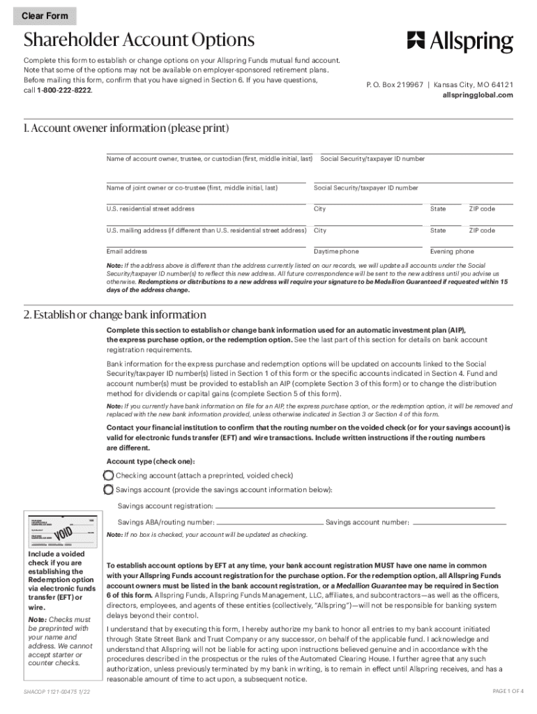 Clear FormShareholder Account Options Complete this form to establish or change options on your All spring Funds mutual fund account. Note that some options may not be available on employer sponsored