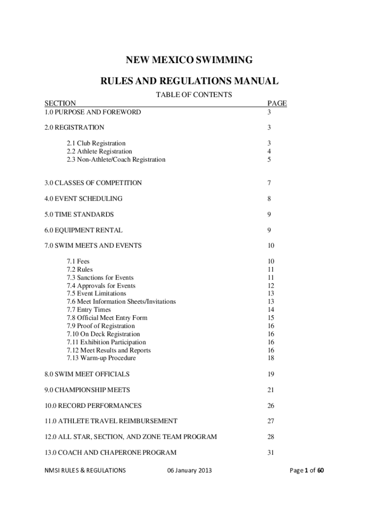 NEW MEXICO SWIMMING RULES AND REGULATIONS MANUAL TABLE OF CONTENTS SECTIONPAGE1.0 PURPOSE AND FOREWORD32.0 REGISTRATION32.1 Club Registration 2.2 Athlete Registration 2.3 Nonathletic/Coach Registration3