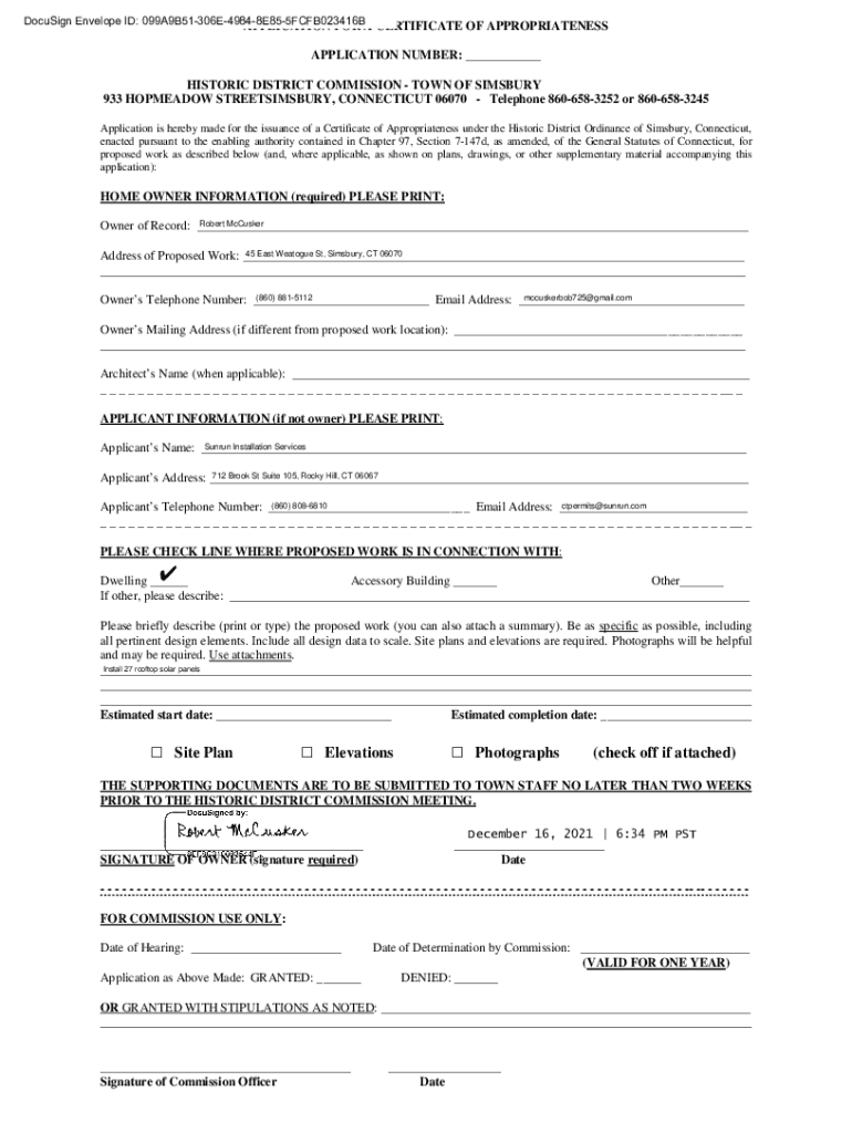 DocuSign Envelope ID: 099A9B51306E49848E855FCFB023416B APPLICATION FOR A CERTIFICATE OF APPROPRIATENESSAPPLICATION NUMBER: ___ HISTORIC DISTRICT COMMISSION TOWN OF SAINSBURY 933 MEADOW STREETSIMSBURY,