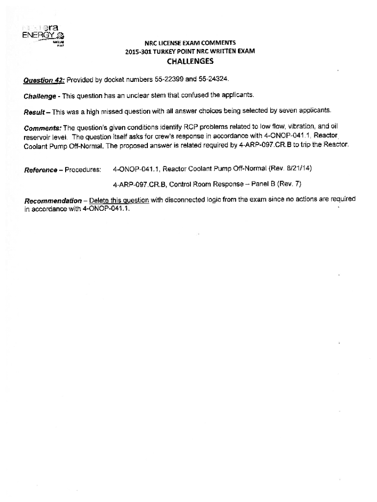 AJH.ENERGY NRC LICENSE EXAM COMMENTS 2015301 TURKEY POINT NRC WRITTEN EXAMCHALLENG ES Question 42: Provided by docket numbers 5522399 and 5524324. Challenge This question has an unclear stem that