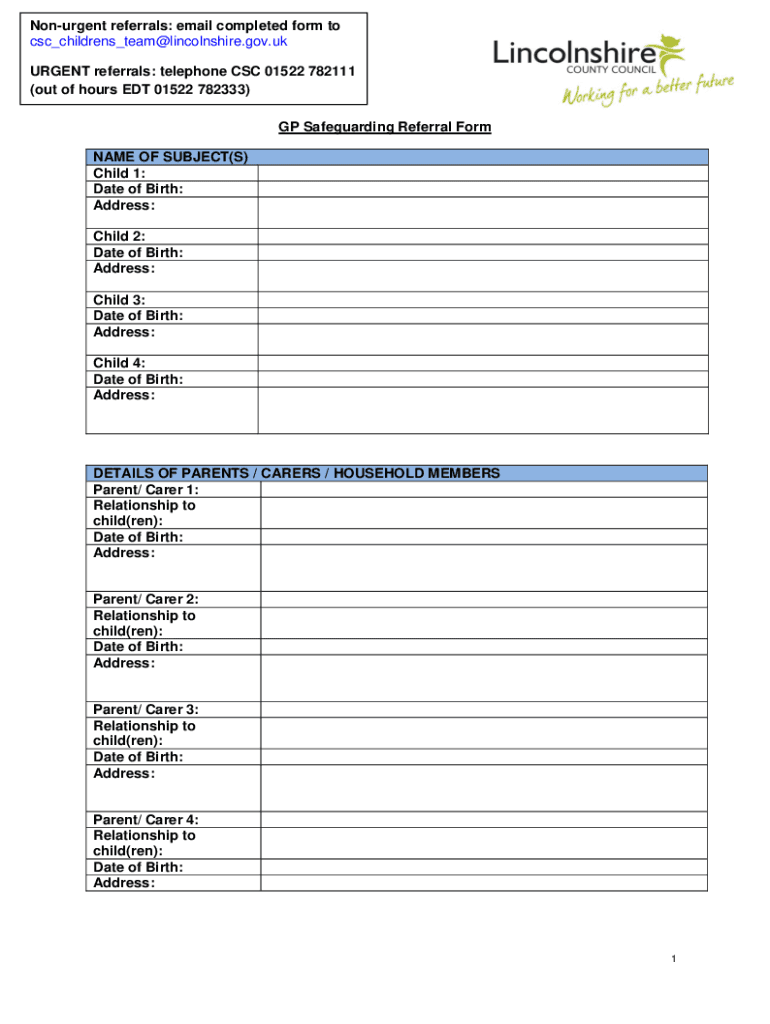 Nonurgent referrals: email completed form to csc_childrens_team@lincolnshire.gov.uk URGENT referrals: telephone CSC 01522 782111 (out of hours EDT 01522 782333) GP Safeguarding Referral Form NAME