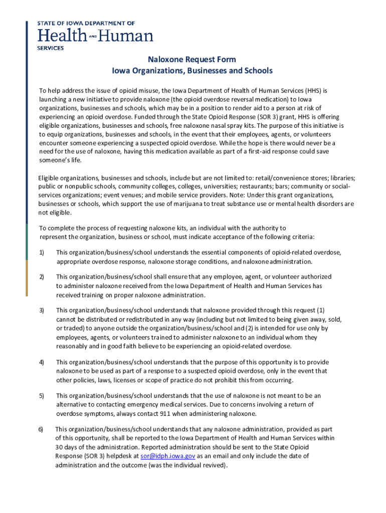Naloxone Request Form Iowa Organizations, Businesses and Schools To help address the issue of opioid misuse, the Iowa Department of Health of Human Services (HHS) is launching a new initiative to