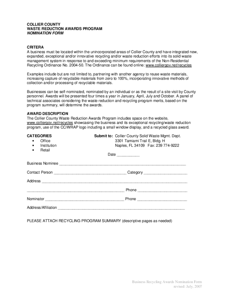 COLLIER COUNTY WASTE REDUCTION AWARDS PROGRAM NOMINATION FORMCRITERA A business must be located within the unincorporated areas of Collier County and have integrated new, expanded, exceptional and/or