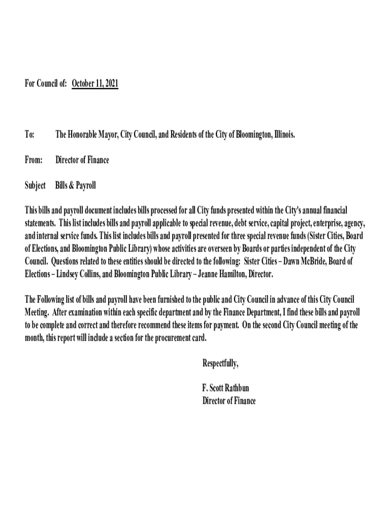 For Council of: October 11, 2021To:The Honorable Mayor, City Council, and Residents of the City of Bloomington, Illinois. From:Director of FinanceSubjectBills & Payrolls bills and payroll document