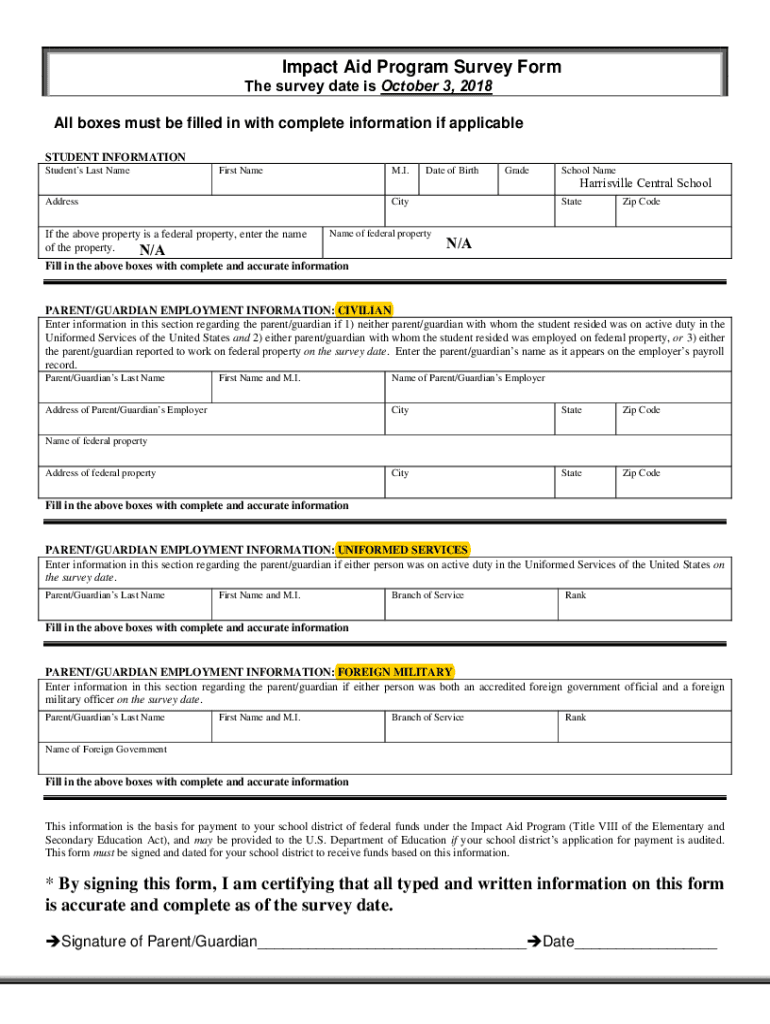 Impact Aid Program Survey Forth survey date is October 3, 2018All boxes must be filled in with complete information if applicable