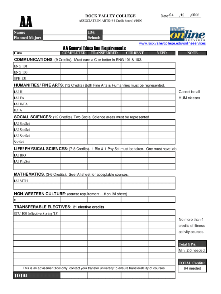 ASSOCIATE IN ARTS (64 Credit hours) #1000Name: Planned Major:ID#: School: www.rockvalleycollege.edu/onlineservicesAA General Education Requirements Class04 12 2022 Date:___/___/___ROCK VALLEY COLLEGECOMPLETEDTRANSFERREDCURRENTNEEDNOTECOMMUNICATIONS: