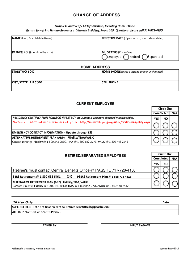 CHANGE OF ADDRESS CompleteandVerifyAllInformation, IncludingHomePhone Return form(s)toHumanResources, DilworthBuilding,Room105. Questionspleasecall7178714950. NAME(Last, First, Middleware)EFFECTIVEDATE(Ifpastaction,