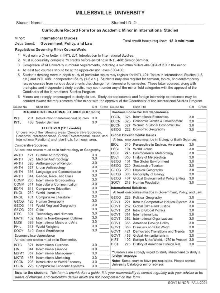 MINERSVILLE UNIVERSITY Student Name: ___ Student I.D. #: ___ Curriculum Record Form for an Academic Minor in International Studies Minor:Department:International Studies Government, Policy, and Total