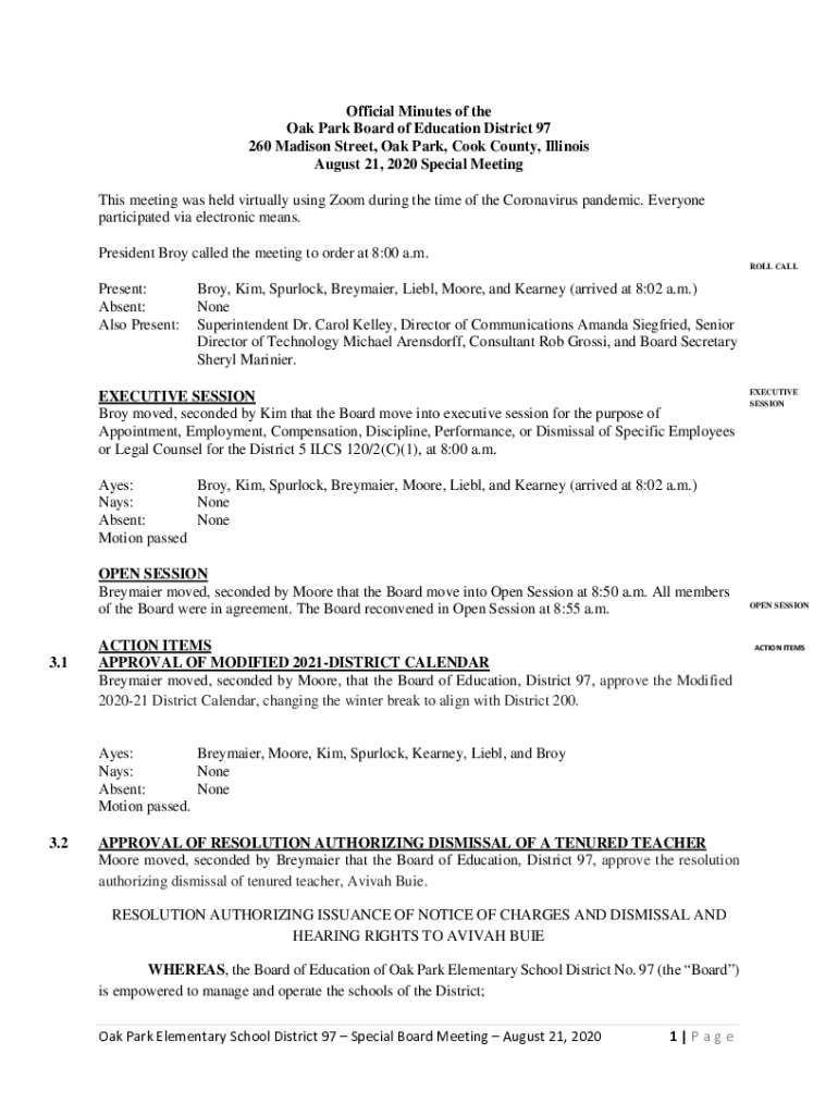 Official Minutes of the Oak Park Board of Education District 97 260 Madison Street, Oak Park, Cook County, Illinois August 21, 2020, Special Meeting This meeting was held virtually using Zoom during