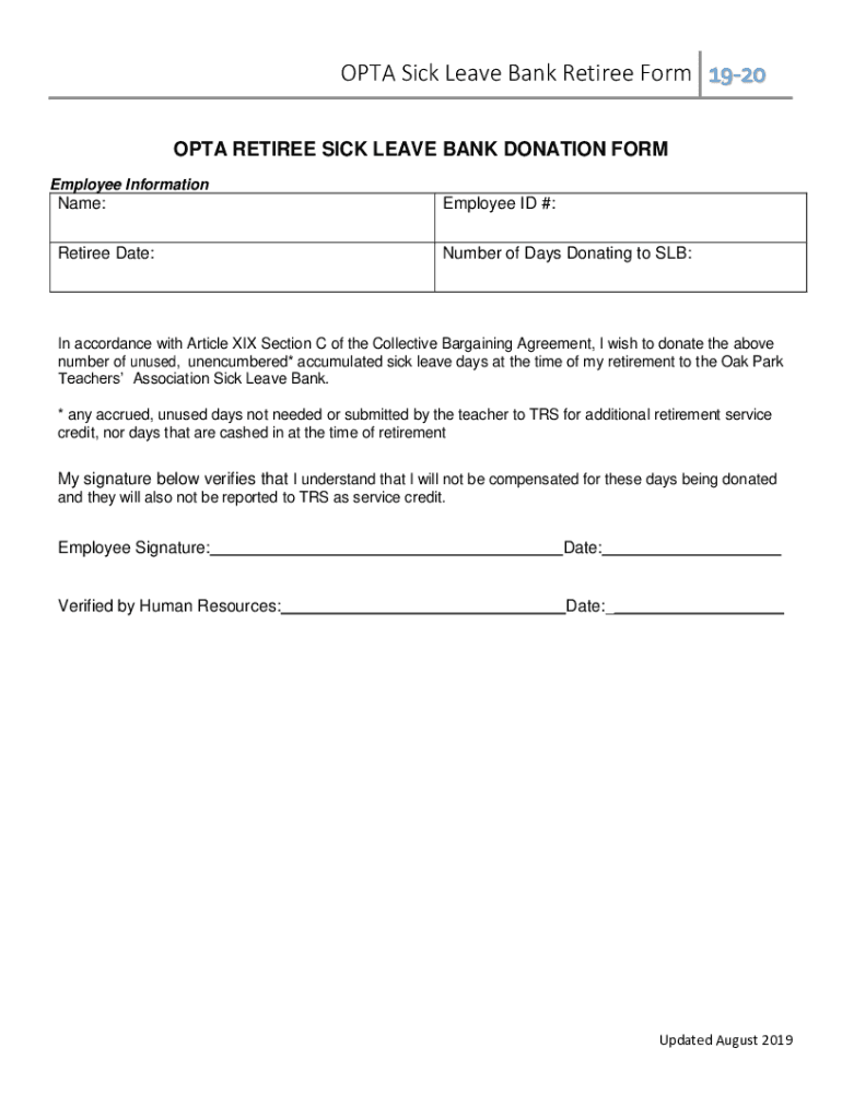 OPT Sick Leave Bank Retiree Form 1920 OPT RETIREE SICK LEAVE BANK DONATION FORM Employee Informational:Employee ID #:Retiree Date:Number of Days Donating to SLB:In accordance with Article XIX Section