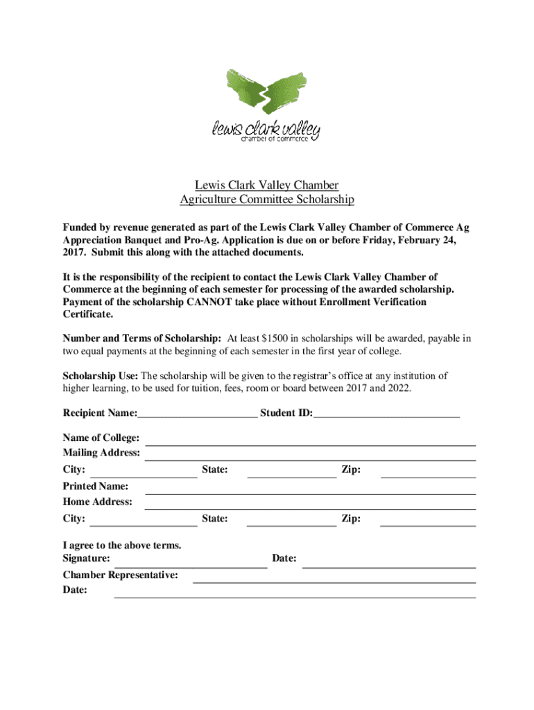 Lewis Clark Valley Chamber Agriculture Committee Scholarship Funded by revenue generated as part of the Lewis Clark Valley Chamber of Commerce Ag Appreciation Banquet and Prong. Application is due