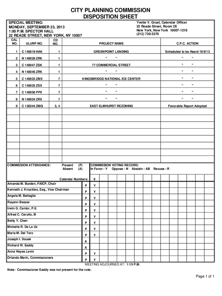CITY PLANNING COMMISSION DISPOSITION SHEET Yvette V. Gruel, Calendar Officer 22 Read Street, Room 2E New York, New York 100071216 (212) 7203370SPECIAL MEETING: MONDAY, SEPTEMBER 23, 2013 1:00 P.M.