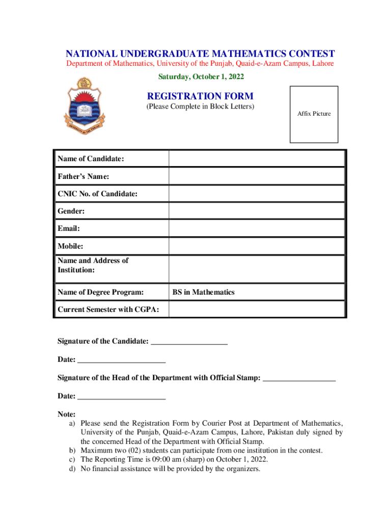 NATIONAL UNDERGRADUATE MATHEMATICS CONTEST Department of Mathematics, University of the Punjab, QuaideAzam Campus, Lahore Saturday, October 1, 2022REGISTRATION FORM (Please Complete in Block Letters)