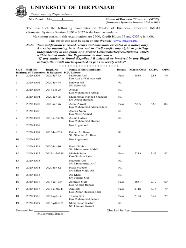 UNIVERSITY OF THE PUNJAB Department of Examinations Notification No___1___. Master of Business Education (BE) (Semester System) Session 2020 2022The result of the following candidates of Master of