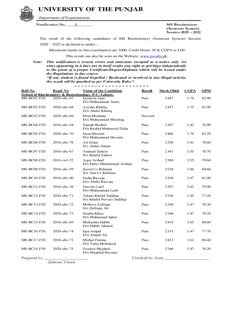 UNIVERSITY OF THE PUNJAB Department of Examinations Notification No___1___.MS Biochemistry (Semester System) Session 2020 2022The result of the following candidates of MS Biochemistry (Semester System)