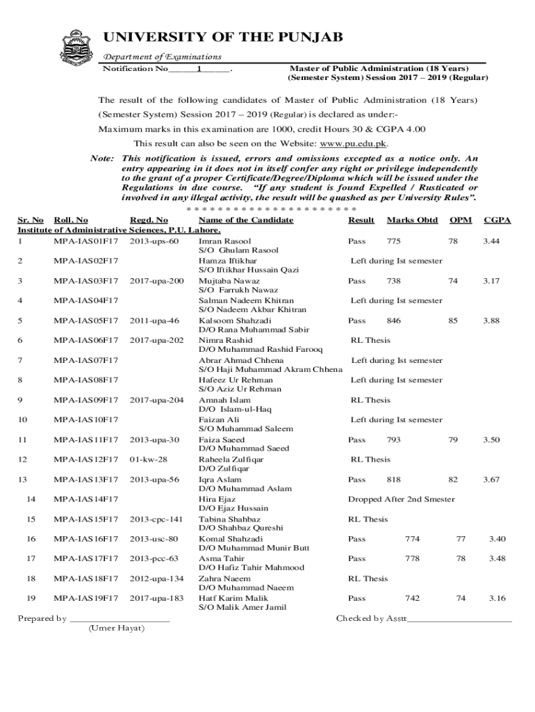 UNIVERSITY OF THE PUNJAB Department of Examinations Notification No___1___. Master of Public Administration (18 Years) (Semester System) Session 2017 2019 (Regular)The result of the following candidates