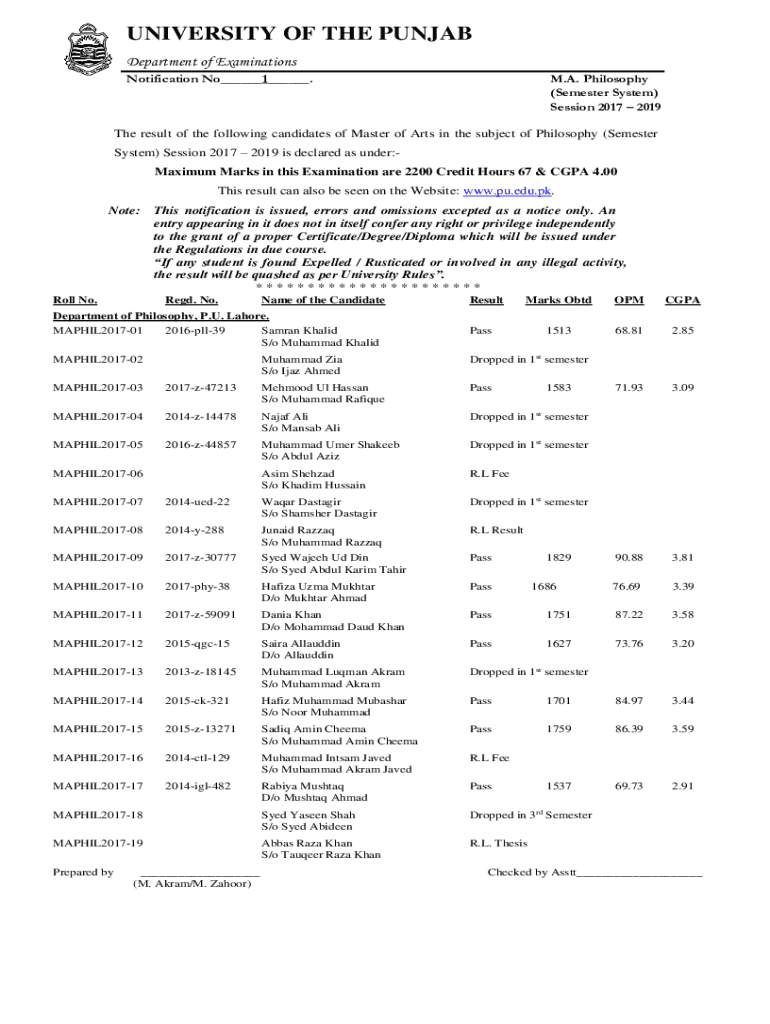 UNIVERSITY OF THE PUNJAB Department of Examinations Notification No___1___. M.A. Philosophy (Semester System) Session 2017 2019The result of the following candidates of Master of Arts in the subject