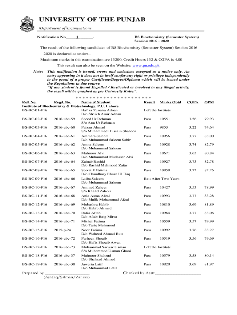 UNIVERSITY OF THE PUNJAB Department of Examinations Notification No___1___.BS Biochemistry (Semester System) Session 2016 2020The result of the following candidates of BS Biochemistry (Semester System)