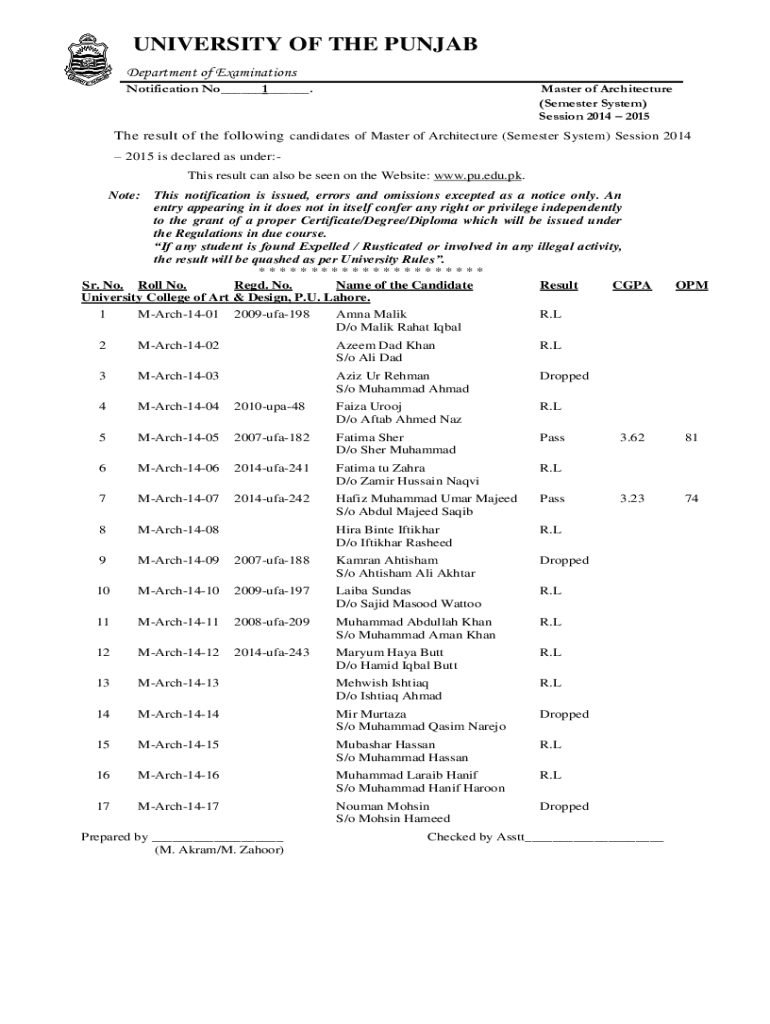UNIVERSITY OF THE PUNJAB Department of Examinations Notification No___1___. Master of Architecture (Semester System) Session 2014 2015The result of the following candidates of Master of Architecture