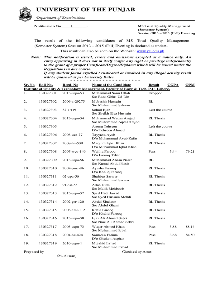 UNIVERSITY OF THE PUNJAB Department of Examinations Notification No___1___.MS Total Quality Management (Semester System) Session 2013 2015 (Fall) Evening result of the following candidates of MS Total