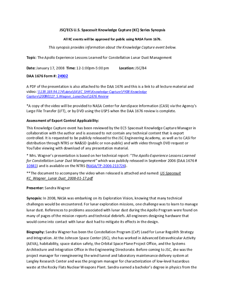 JSC/EC5 U.S. Spacesuit Knowledge Capture (KC) Series Synopsis All KC events will be approved for public using NASA Form 1676. This synopsis provides information about the Knowledge Capture event below.