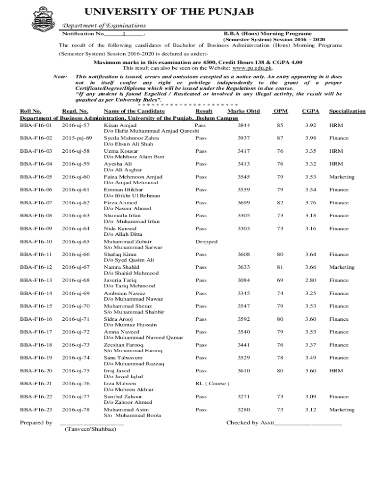 UNIVERSITY OF THE PUNJAB Department of Examinations Notification No___1___. B.B.A (Hons) Morning Program (Semester System) Session 2016 2020 The result of the following candidates of Bachelor of Business