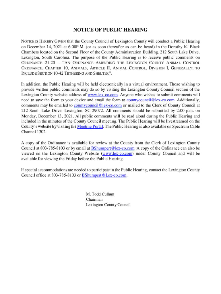 NOTICE OF PUBLIC HEARING NOTICE IS HEREBY GIVEN that the County Council of Lexington County will conduct a Public Hearing on December 14, 2021, at 6:00P. M. (or as soon thereafter as can be heard)