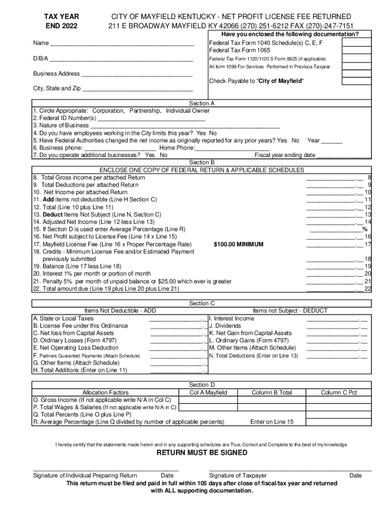 END 2022CITY OF MAYFIELD KENTUCKY NET PROFIT LICENSE FEE RETURNED