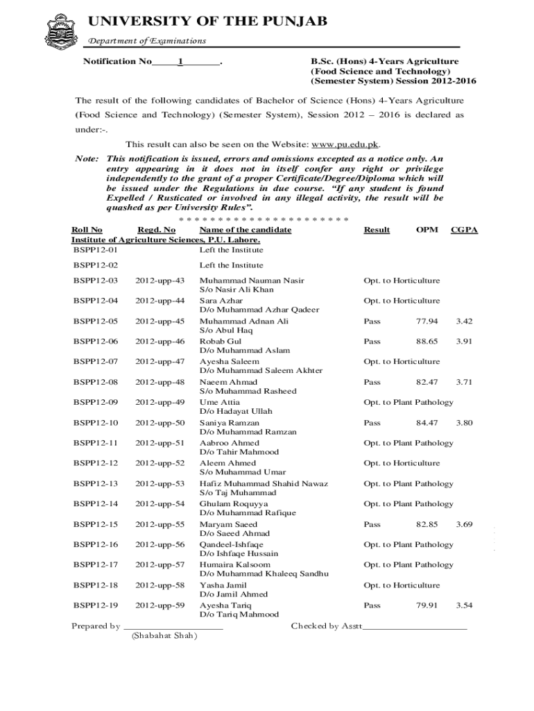 UNIVERSITY OF THE PUNJAB Department of Examinations Notification No___1___. B.Sc. (Hons) 4Years Agriculture (Food Science and Technology) (Semester System) Session 20122016The result of the following