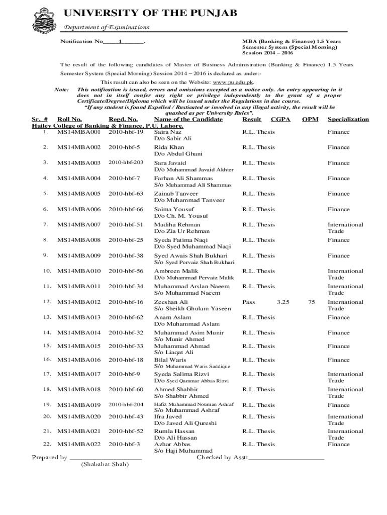 UNIVERSITY OF THE PUNJAB Department of Examinations Notification No___1___.MBA (Banking & Finance) 1.5 Years Semester System (Special Morning) Session 2014 2016The result of the following candidates