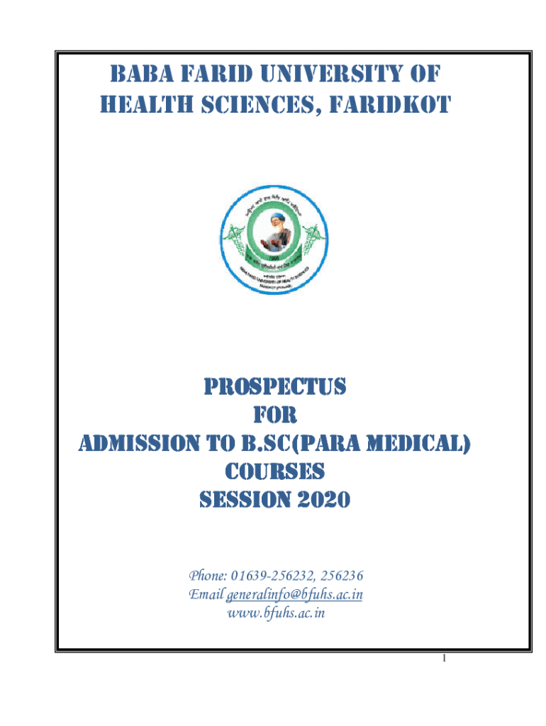 BABA FARID UNIVERSITY OF HEALTH SCIENCES, FARIDKOTPROSPECTUS FOR ADMISSION TO B.SC. B.SC.(PARA MEDICAL) COURSES SESSION 2020 Phone: 01639256232, 256236 Email generalinfo@bfuhs.ac.in www.bfuhs.ac.in